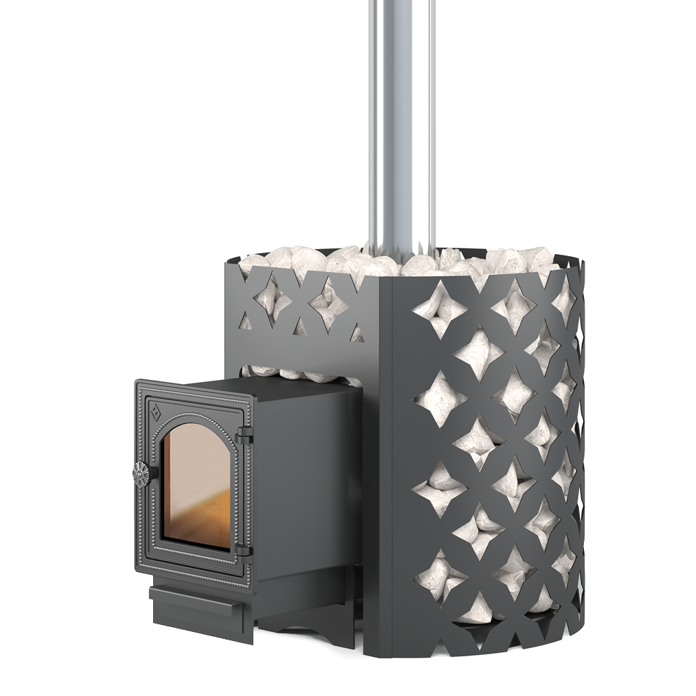 Чугунная банная печь ЭТНА 24 (ДТ-4С) рассчитана на работу в парной объёмом до 24 м3. Цельно литая чугунная дверца сохраняет свою форму при нагревании. Крепление дверок к топочному тоннелю – болтовое, позволяет снимать и заменять дверку. Для устройства наружной открытой каменки печь ЭТНА 24 оснащается металлическим кожухом с прорезным рисунком оригинального дизайна. Пространство между печью и кожухом из двухмиллиметровой стали заполняется камнями для бани, которые выполняют роль теплонакопителя и защищают парящихся от жёсткого инфракрасного излучения. Кожух диаметром 620 миллиметров вмещает в себя до 150 килограммов камней крупной и средней фракции.