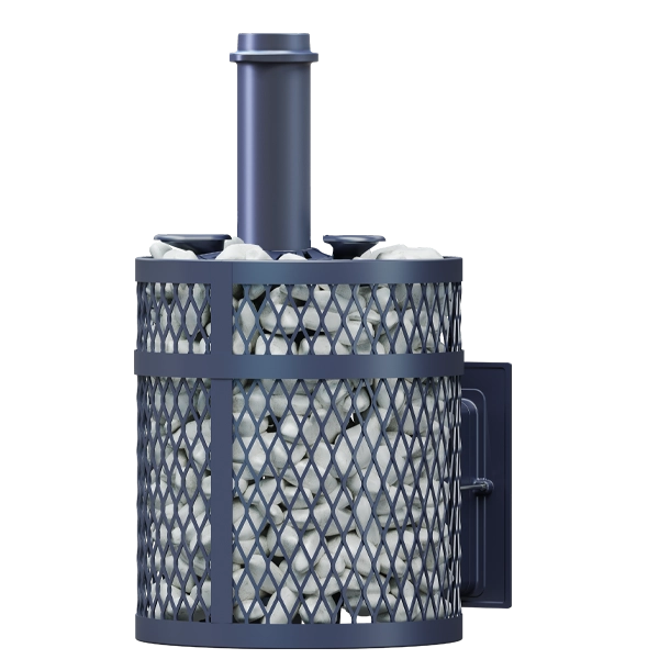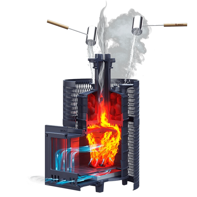 Чугунная банная печь с прямым нагревом парообразователя. Печь со стенками толщиной 14 миллиметров быстро нагревает воздух в парной и производит качественный мелкодисперсный пар за счёт теплоёмкой каменки, оснащённой теплосъёмными шипами на нижней поверхности.