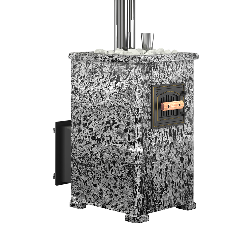 Данную модель печи отличает от аналогов то, что закрытая каменка расположена внутри топки. Это позволяет максимально быстро и хорошо прогревать камни, которые расположены внутри каменки. На камни через специальную трубку с отверстиями поддается вода, которая моментально испаряется, превращаясь в мелкодисперсный пар.