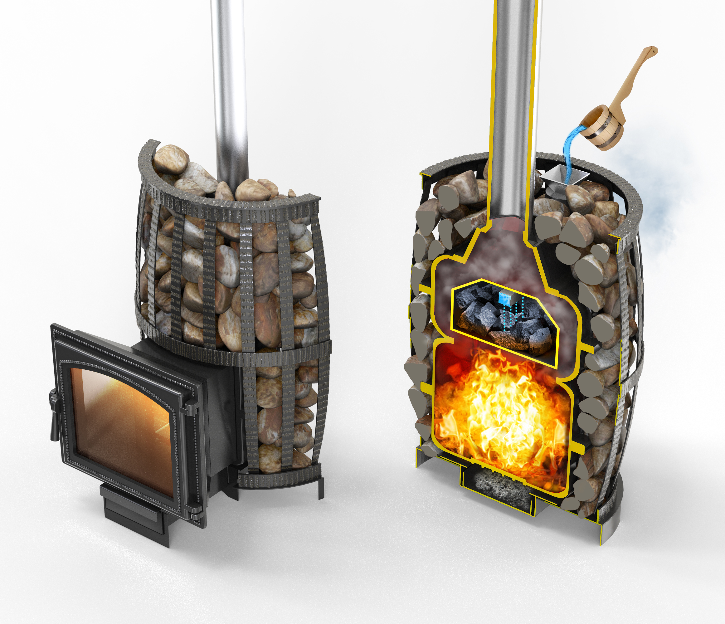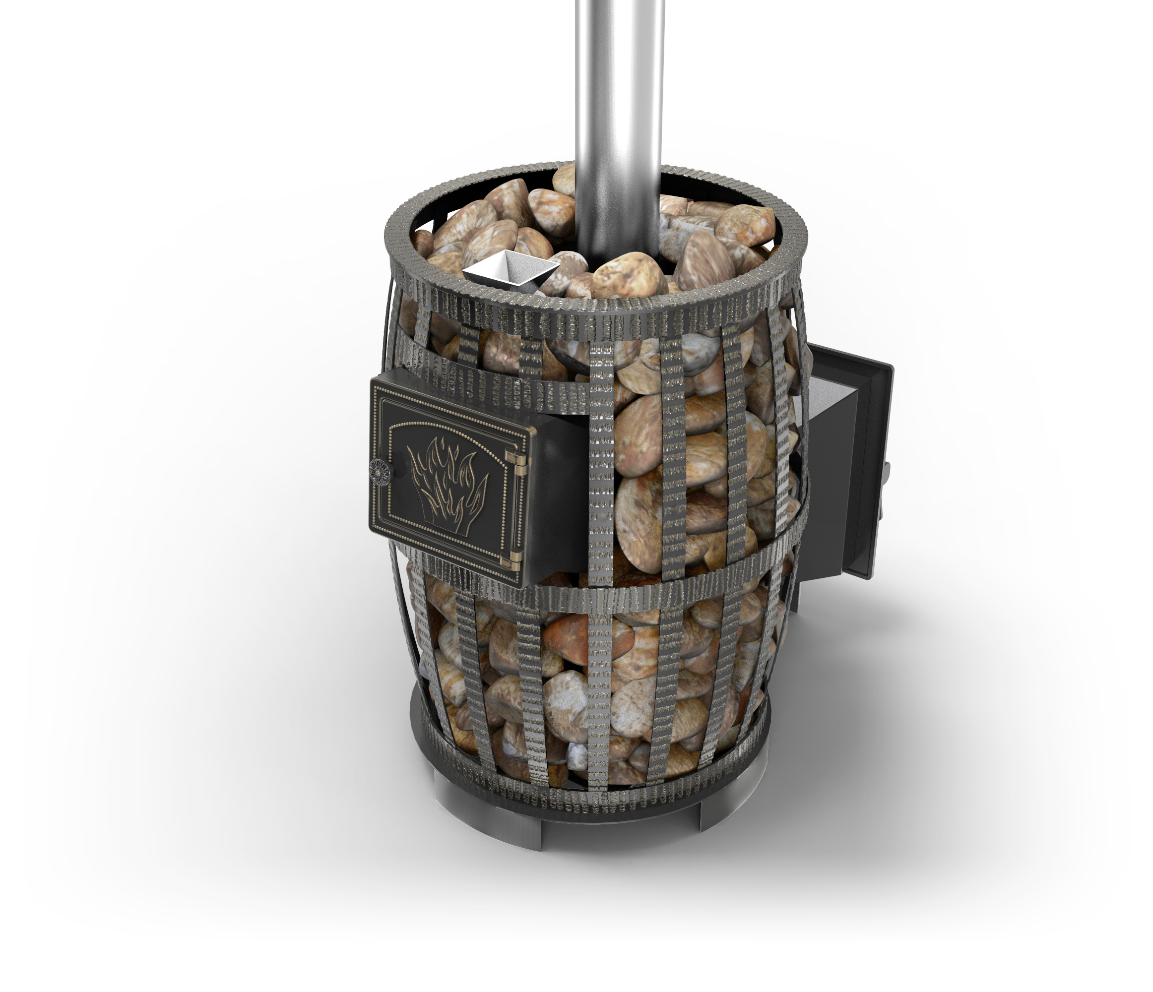 В печах Легенда Русский пар представлена новая конструкция закрытой каменки. Она охвачена круговым потоком пламени, камни в такой каменке прогреваются до температуры 600 °С, что позволяет создать в парилке наиболее благоприятный микроклимат, не пересушивая и не перегревая воздух. Вода подается в самую горячую центральную часть закрытой каменки через воронку (при этом дверь закрытой каменки должна быть приоткрыта для поступления мелкодисперсного пара в парное отделение). Закрытая каменка изготовлена из жаростойкой высоколегированной 4 мм нержавеющей стали. Вес камней в закрытой каменке 25 кг.