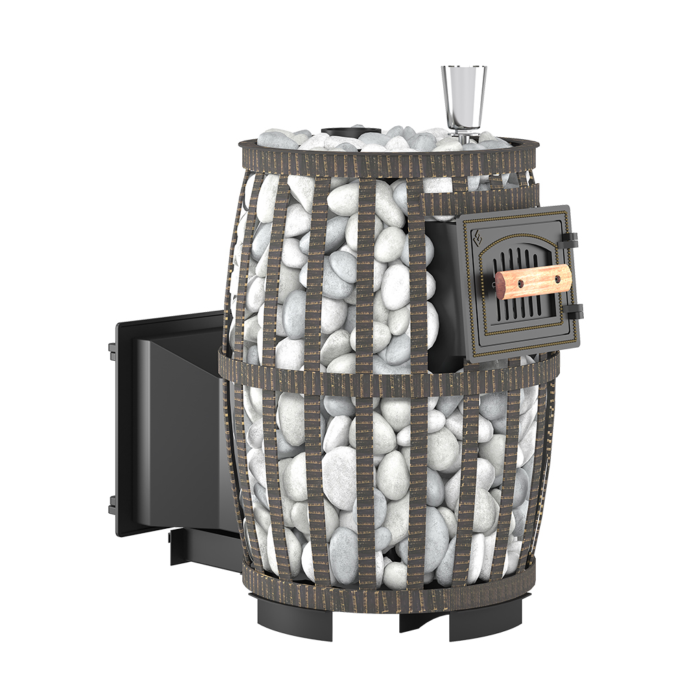 Печь для бани Везувий Легенда Русский пар ковка 18 (505) имеет сетчатый кожух-конвектор, выполненный из металлической текстурированной полосы, покрашенной термостойкой краской и покрытой патиной Бронза. Закладка камнем в таком кожухе позволяет в разы уменьшить излучение, получаемое от металла печи, при этом камень прекрасно аккумулирует тепло и сохраняет его на протяжении длительного времени. Конструкция печи Везувий рассчитана на установку в парильном помещении с выходом топки в смежное помещение. Панорамная дверка шириной стекла 365 мм позволит наблюдать за огнем из комнаты отдыха.