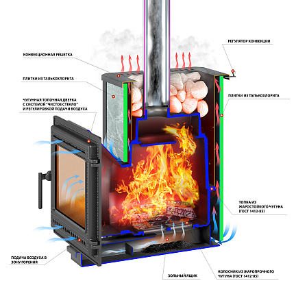 Конвекционно–вентилируемая облицовка, изготовленная из экологически чистой горной породы , который обладает большой теплоёмкостью, что позволяет камню в короткие сроки нагреваться и максимально долго удерживать стабильную температуру в парильном помещении, а также гасить жёсткое инфракрасное излучение Камень обладает исключительными лечебными свойствами: помогает при головных болях, при нестабильном артериальном давлении, при простудных заболеваниях, воспалительных процессах в почках и пищеварительной системе, снимает повышенную возбудимость и нервозность, сглаживает эмоциональные всплески. Облицовка из натурального камня при нагреве способна аккумулировать тепло, что гарантирует максимально равномерный прогрев и сохранение тепла Банная печь Легенда 16 Панорама "М" талькохлорит укомплектован чугунной каминной, самоохлаждаемой дверцей Везувий 505 с большим жаропрочным стеклом «SCHOTT ROBAX», с оборудованной системой самоочистки, что позволяет визуально контролировать горение и любоваться видом живого огня. Данная печь рассчитана на объем парильного помещения 8-18 м3.Дымоход и комплектующие