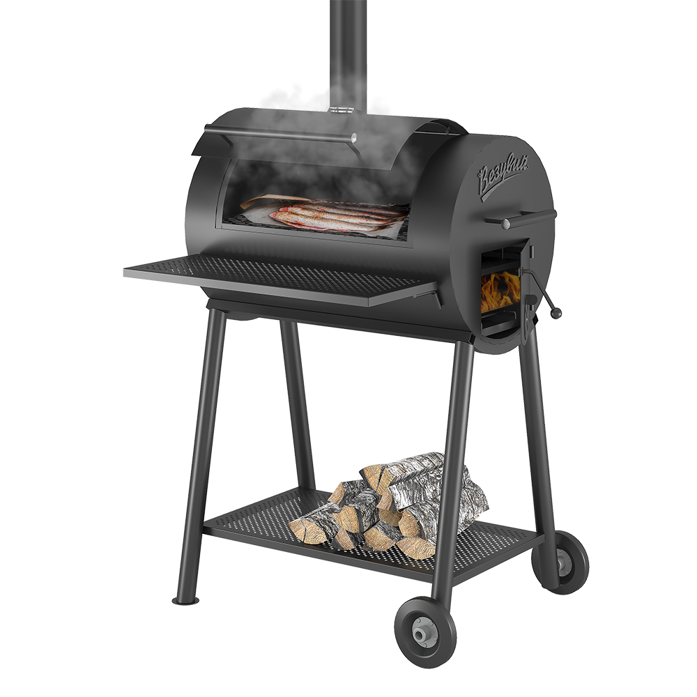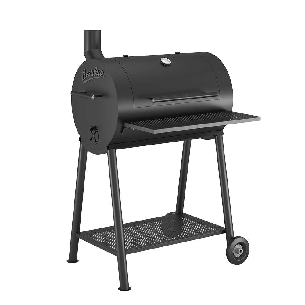 Для удобного использования на передней поверхности смокера сделана съёмная стальная полка для размещения продуктов и посуды. Смокер установлен на подставке с надёжными стальными ножками. В нижней части подставки сделана полка, на которой удобно хранить дрова и инструменты для работы со смокером. Две ножки смокера оснащены колёсами для удобства перемещения изделия по зоне барбекю. Для перекатывания смокера используется ручка на боковой стороне основного модуля смокера.