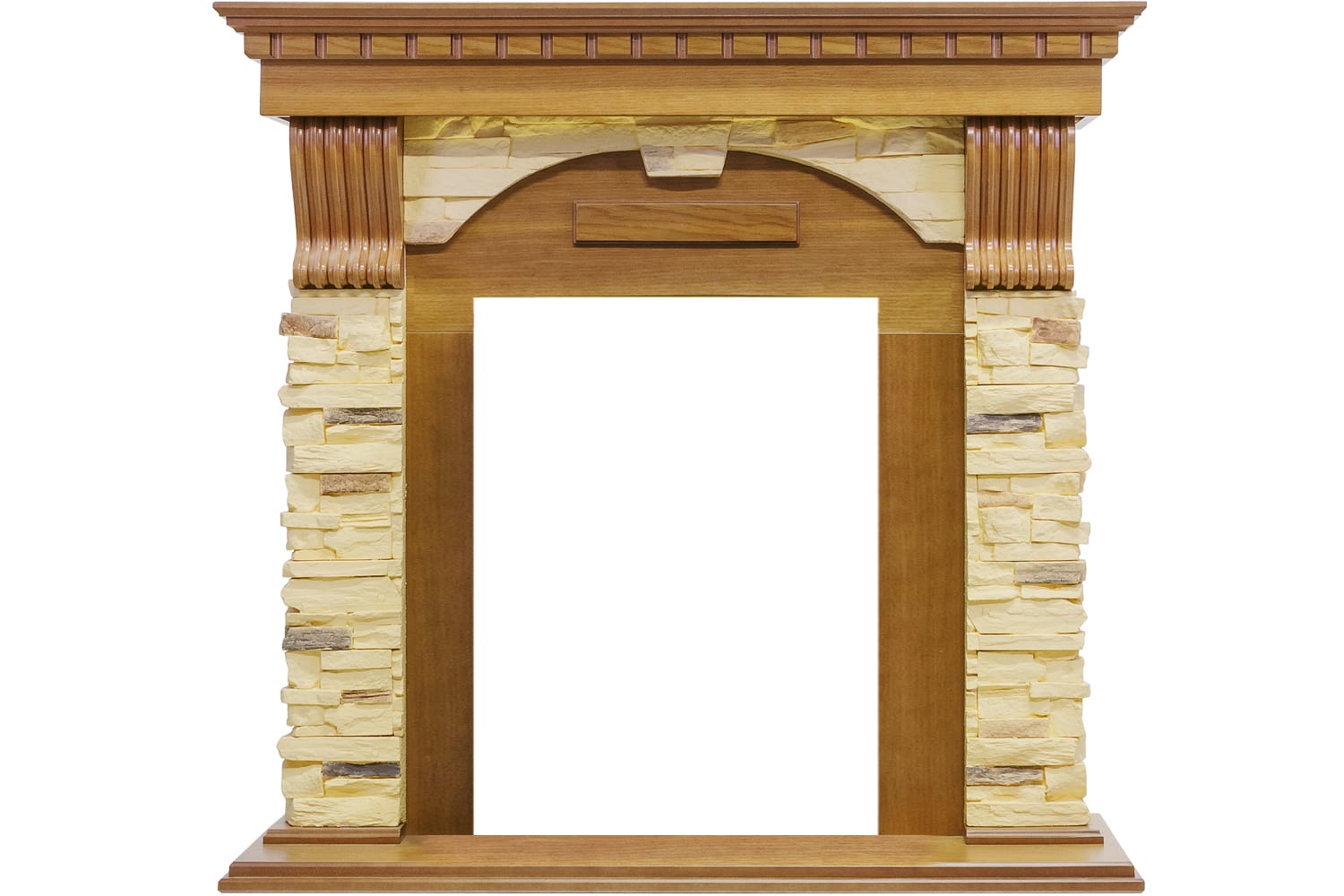 Портал Dublin выполнен в классическом стиле с античными элементами. Боковые колонны из светлого камня, стилизованного под натуральную сланцевую породу, дополнены резными узорами контрастного цвета. Столешница и постамент выполнены из дерева. Такое сочетание материалов подчеркивает изысканность портала и делает его выгодным приобретением для практических любых интерьеров.
