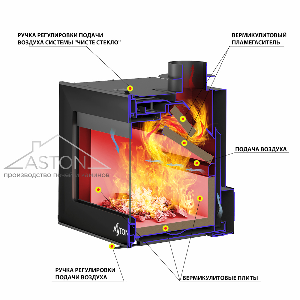 Топка АСТОН (ASTON) Сенатор (Senator) внутри облицовки размещается на подставке. Топка, подставка и облицовка отлично походят друг к другу и не требуют дополнительной подгонки. Свободное пространство между топкой и облицовкой предназначено для движения нагретого воздуха. Именно за счёт конвекции быстро нагревается пространство, что уже в первые минуты работы топки обеспечивает тепло в помещении.