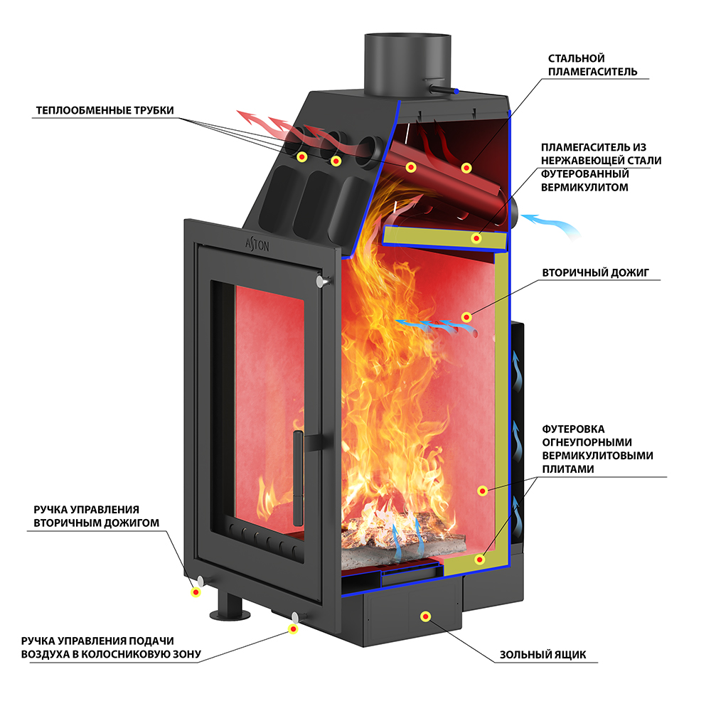 Топка АСТОН (ASTON) Вертикаль внутри облицовки размещается на подставке. Топка, подставка и облицовка отлично походят друг к другу и не требуют дополнительной подгонки. Свободное пространство между топкой и облицовкой предназначено для движения нагретого воздуха. Именно за счёт конвекции быстро нагревается пространство, что уже в первые минуты работы топки обеспечивает тепло в помещении.