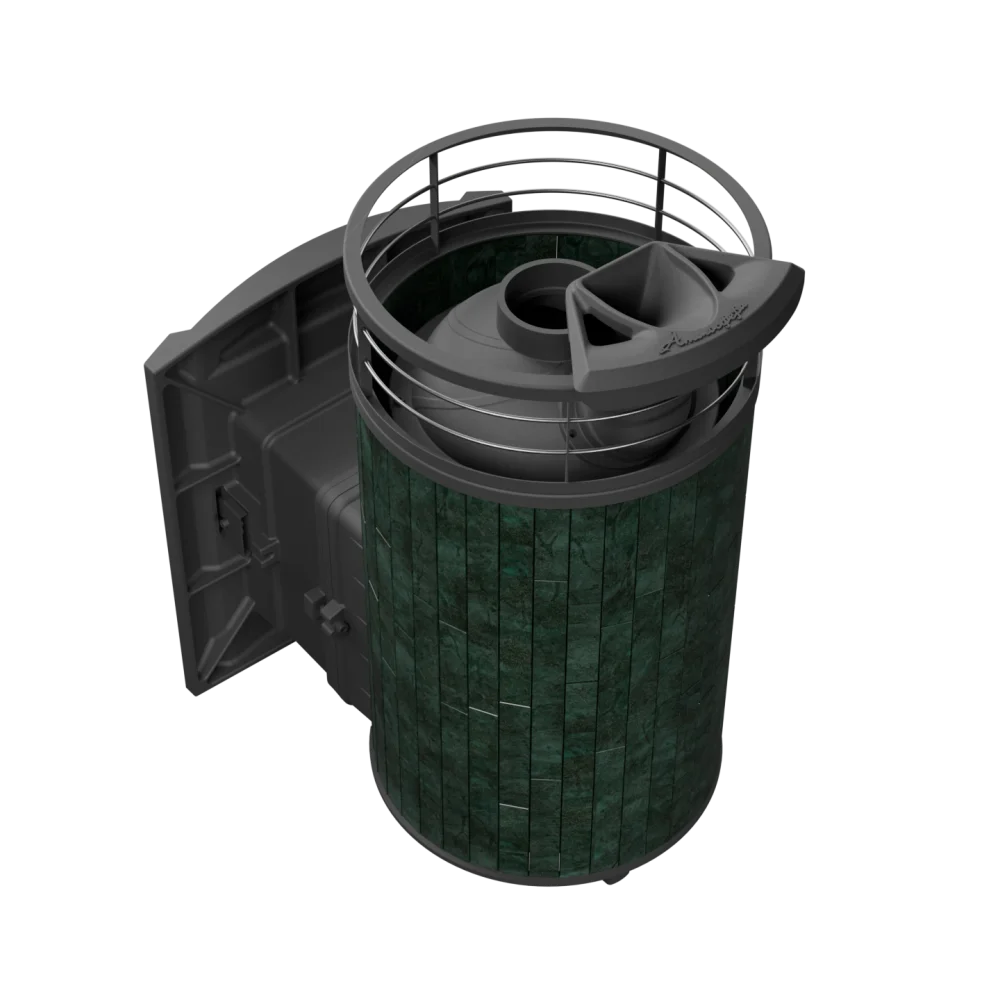 Печь для бани Атмосфера в ламели из натурального камня по периметру внешней каменки не только обладают хорошими теплонакопительными свойствами, но и придают печи оригинальный внешний вид.