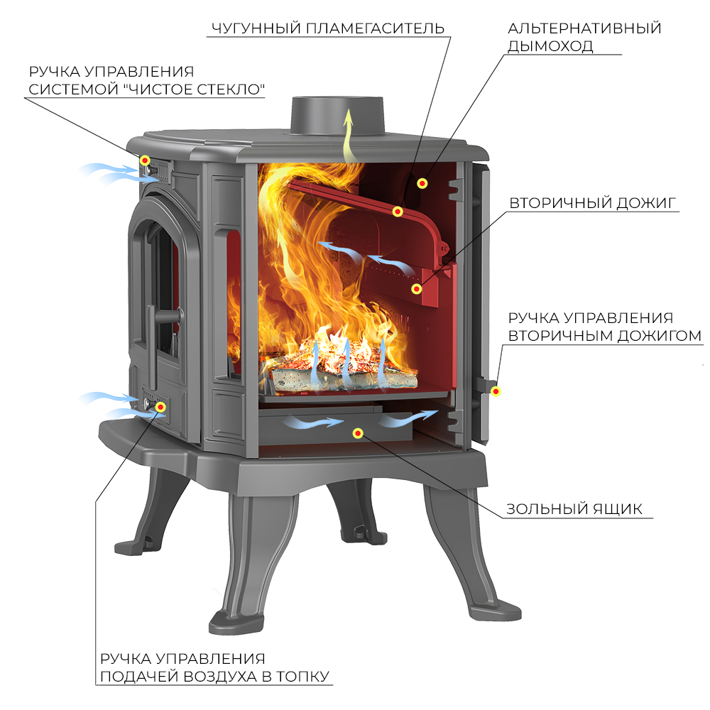 Вторичный дожиг в печи-камине обеспечивается двойной задней стенкой: здесь между стенкой и внутренней облицовкой топки из чугуна есть канал, идущий из поддувала под нижний край пламегасителя, в зону активного горения. Воздух для вторичного дожига поступает в верхнюю часть топки, усиливая горение и повышая теплоотдачу. Вторичный дожиг регулируется заслонкой, расположенной на задней стенке печи-камина. Ручка управления заслонкой находится справа.