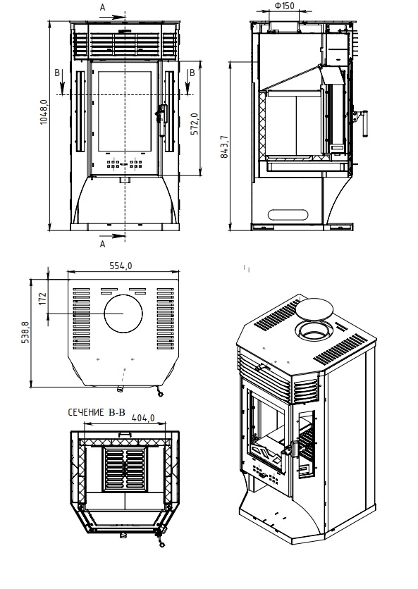 Печь оснащена призматической дверцей с крупными стеклами.