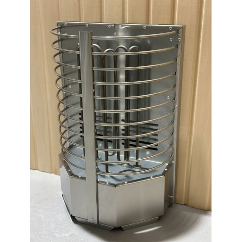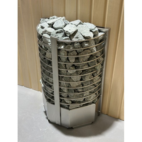 Электрокаменка выполнена из качественной нержавеющей стали и представляет собой полукруг с радиусными прутьями, вмещающий 60 кг камня.