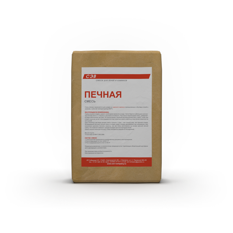 Готовая печная смесь компании "СЭВ" (г. Боровичи) применяется для кладки промышленных и бытовых печей и каминов из красного кирпича, с рабочей температурой до 850°С.